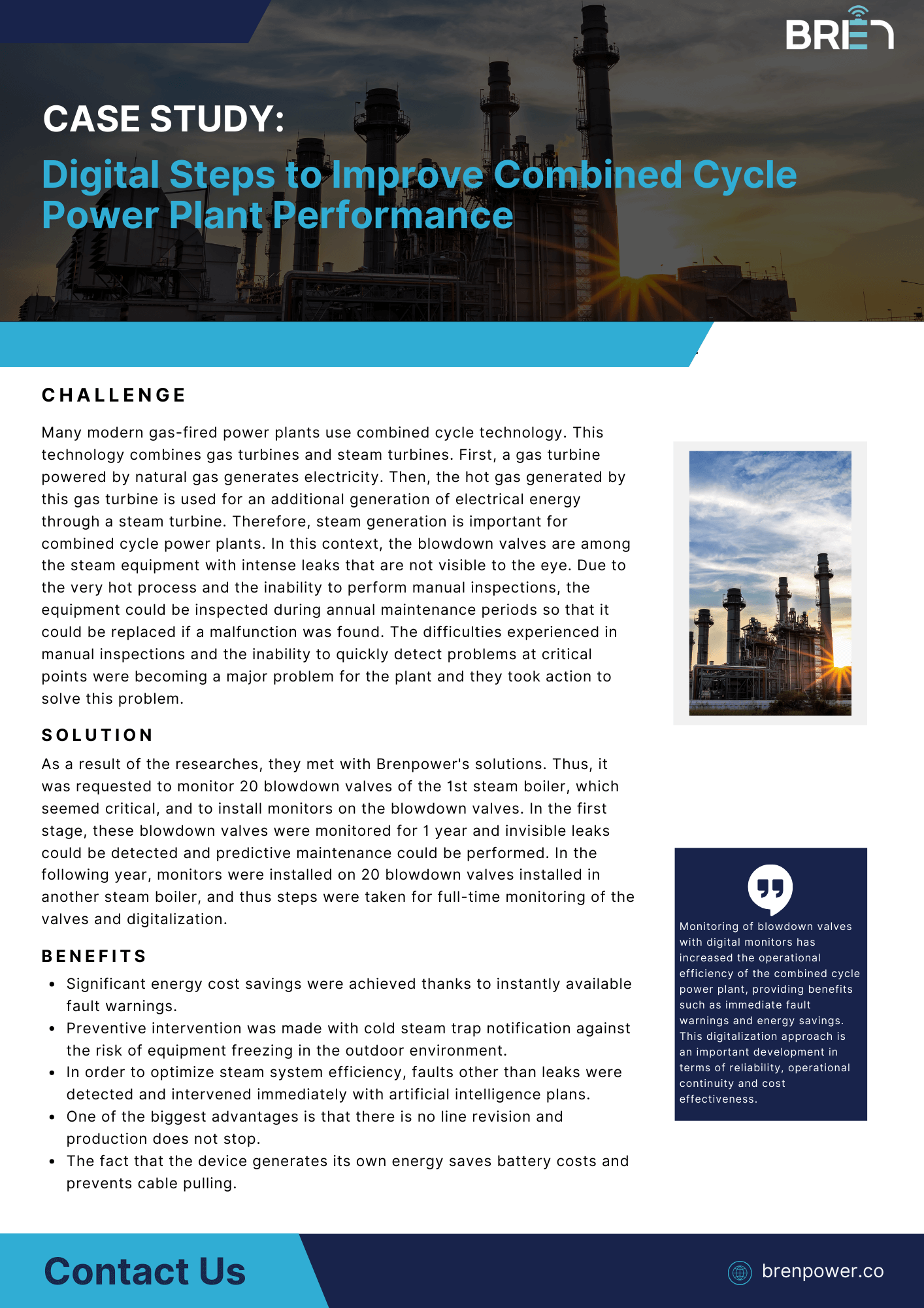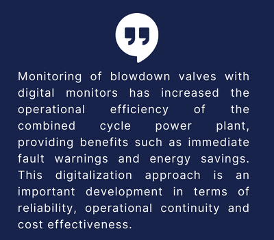 Many modern gas-fired power plants use combined cycle technology. This technology combines gas turbines and steam turbines. First, a gas turbine powered by natural gas generates electricity. Then, the hot gas generated by this gas turbine is used for an additional generation of electrical energy through a steam turbine. Therefore, steam generation is important for combined cycle power plants. In this context, the blowdown valves are among the steam equipment with intense leaks that are not visible to the eye. Due to the very hot process and the inability to perform manual inspections, the equipment could be inspected during annual maintenance periods so that it could be replaced if a malfunction was found. The difficulties experienced in manual inspections and the inability to quickly detect problems at critical points were becoming a major problem for the plant and they took action to solve this problem.